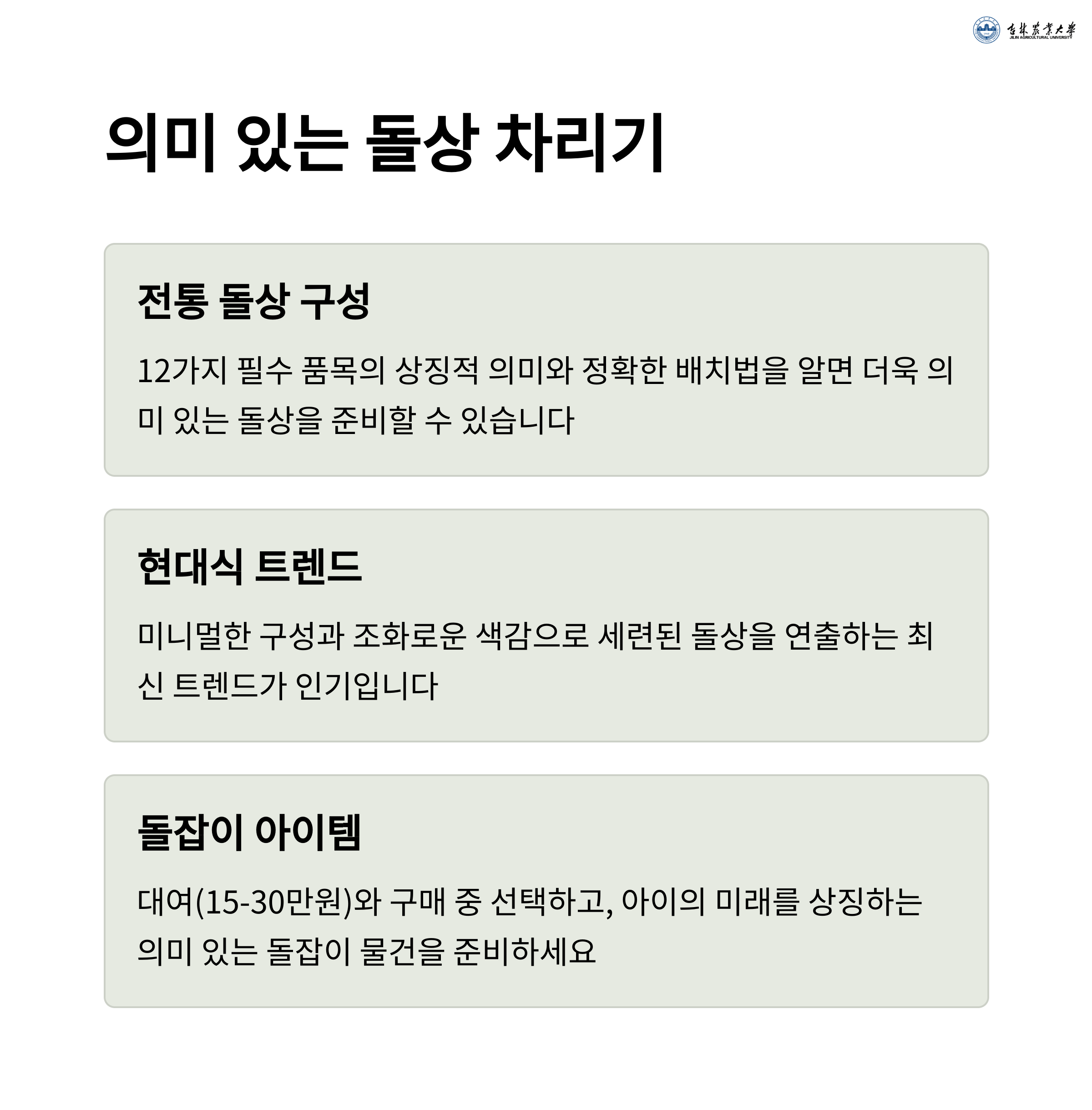 - 실용 돌상: 사진 위주의 간단 구성 + 포토존