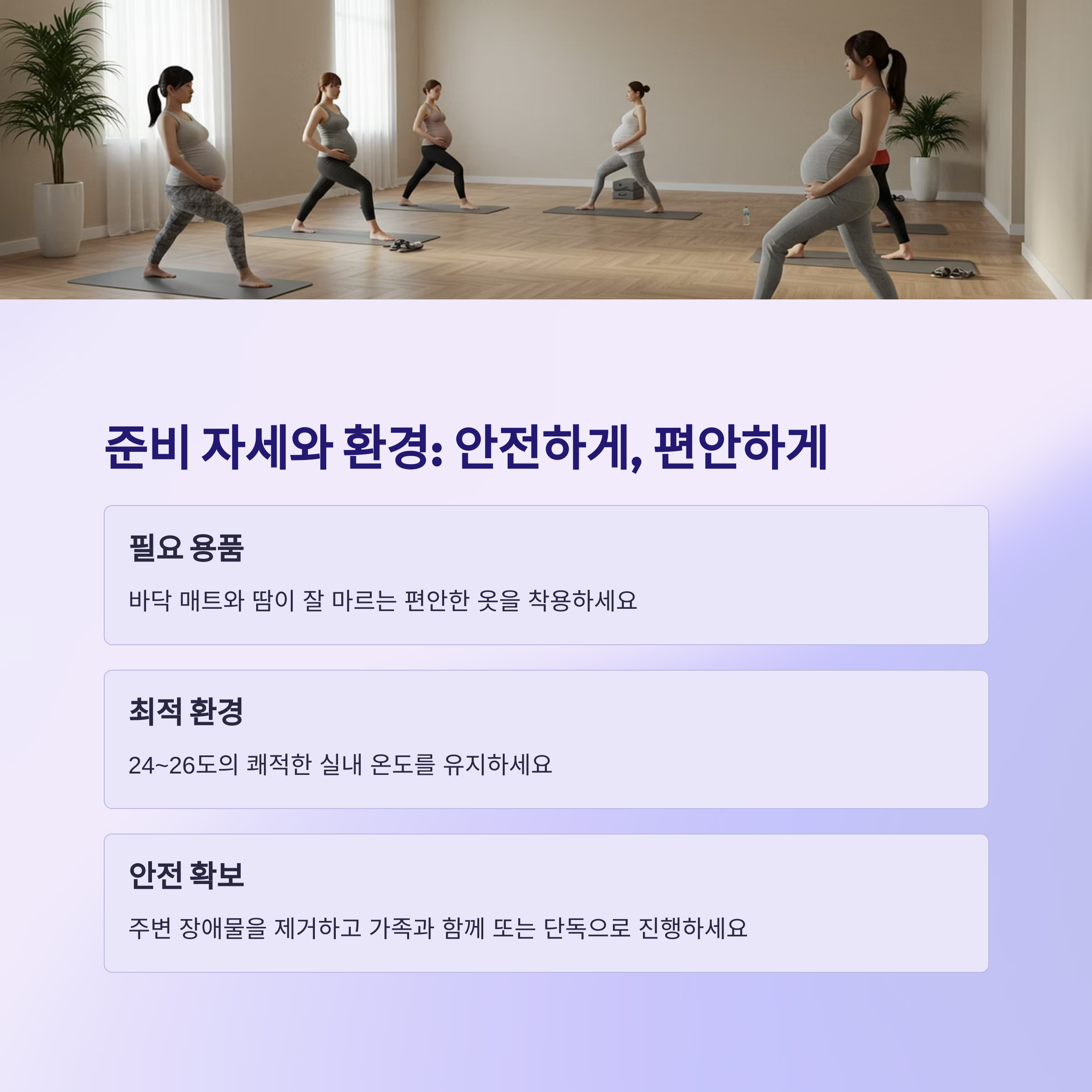 바닥은 푹신한 요가 매트나 카펫 위에서, 실내 온도는 따뜻하고 조용한 곳이 좋아요.