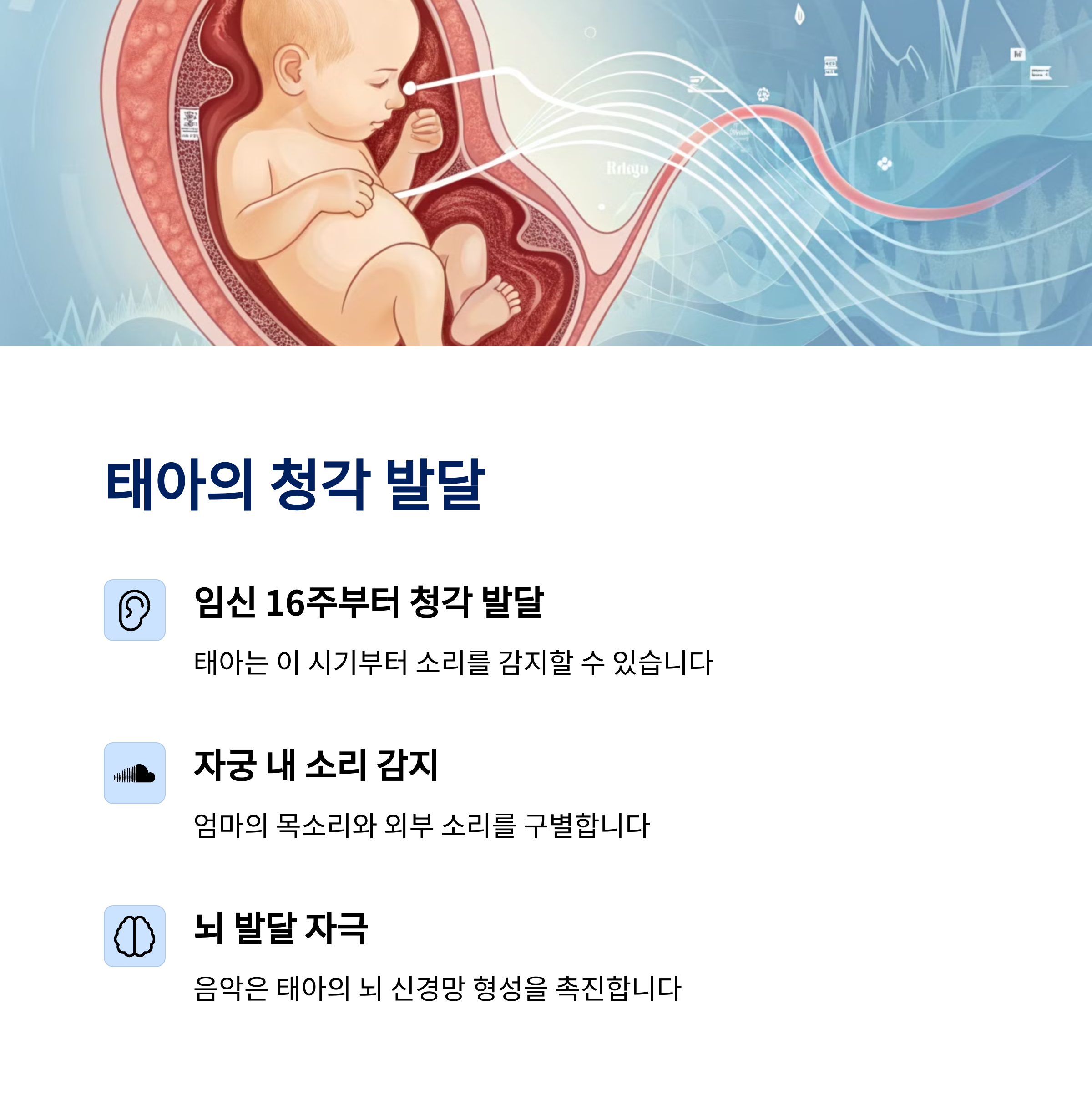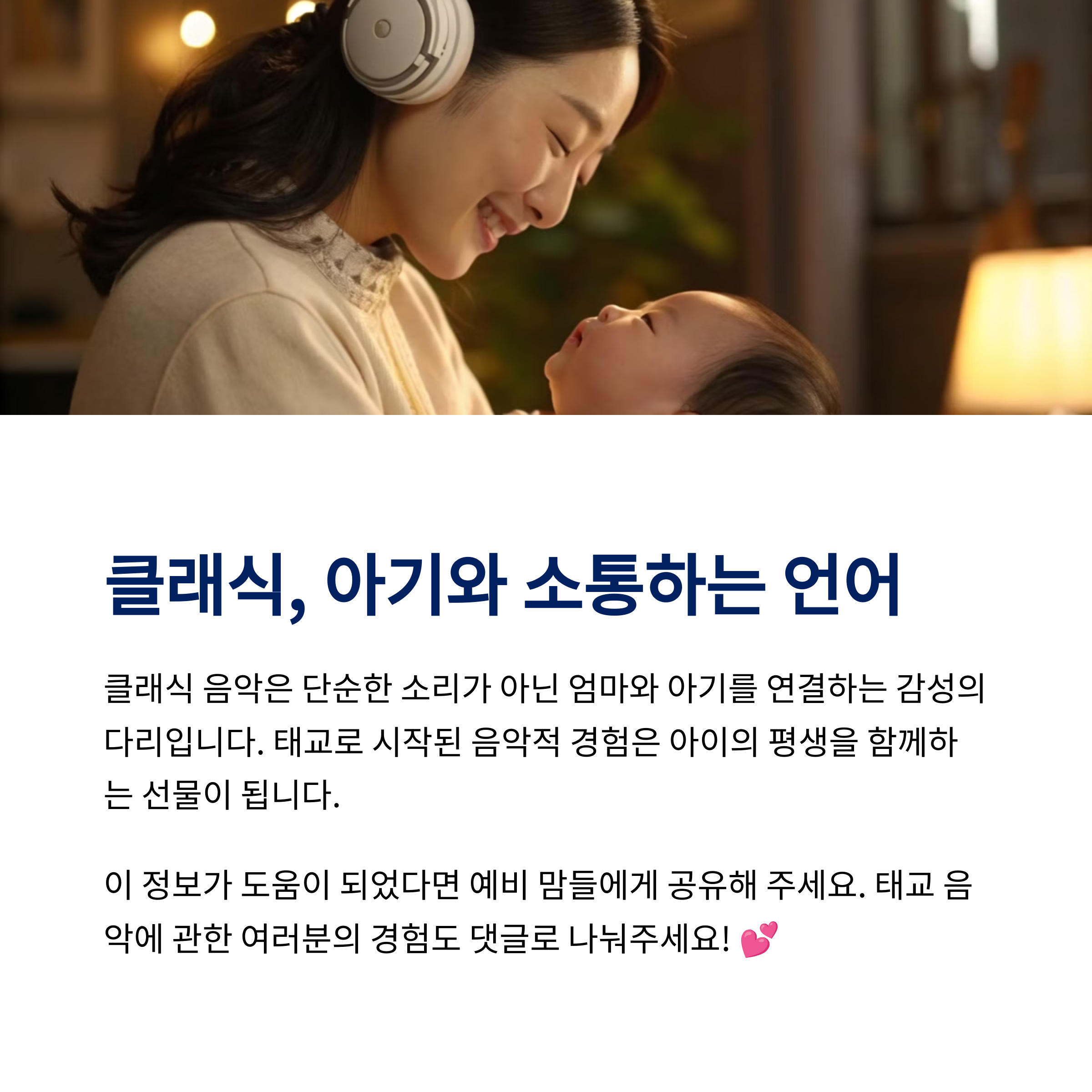 | 반복 감상 시 교감 효과 상승 | 아이의 정서 발달 및 언어 습득 도움 | 다양한 장르의 곡을 시도해보는 것도 추천 |