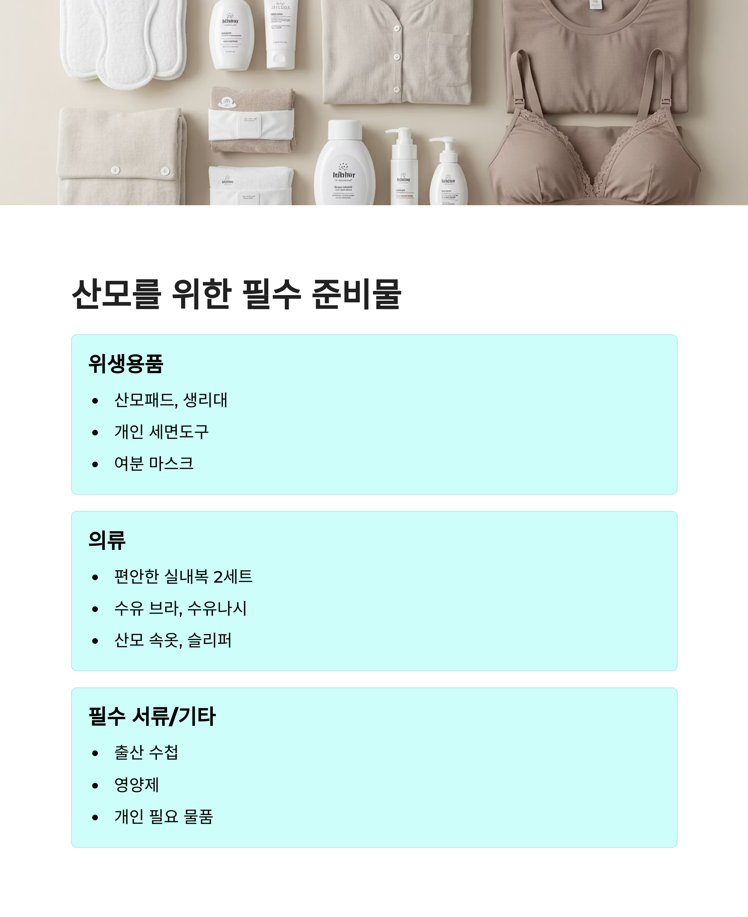 | 수유용품 | 수유패드, 수유쿠션 (병원 대여 여부 확인) |