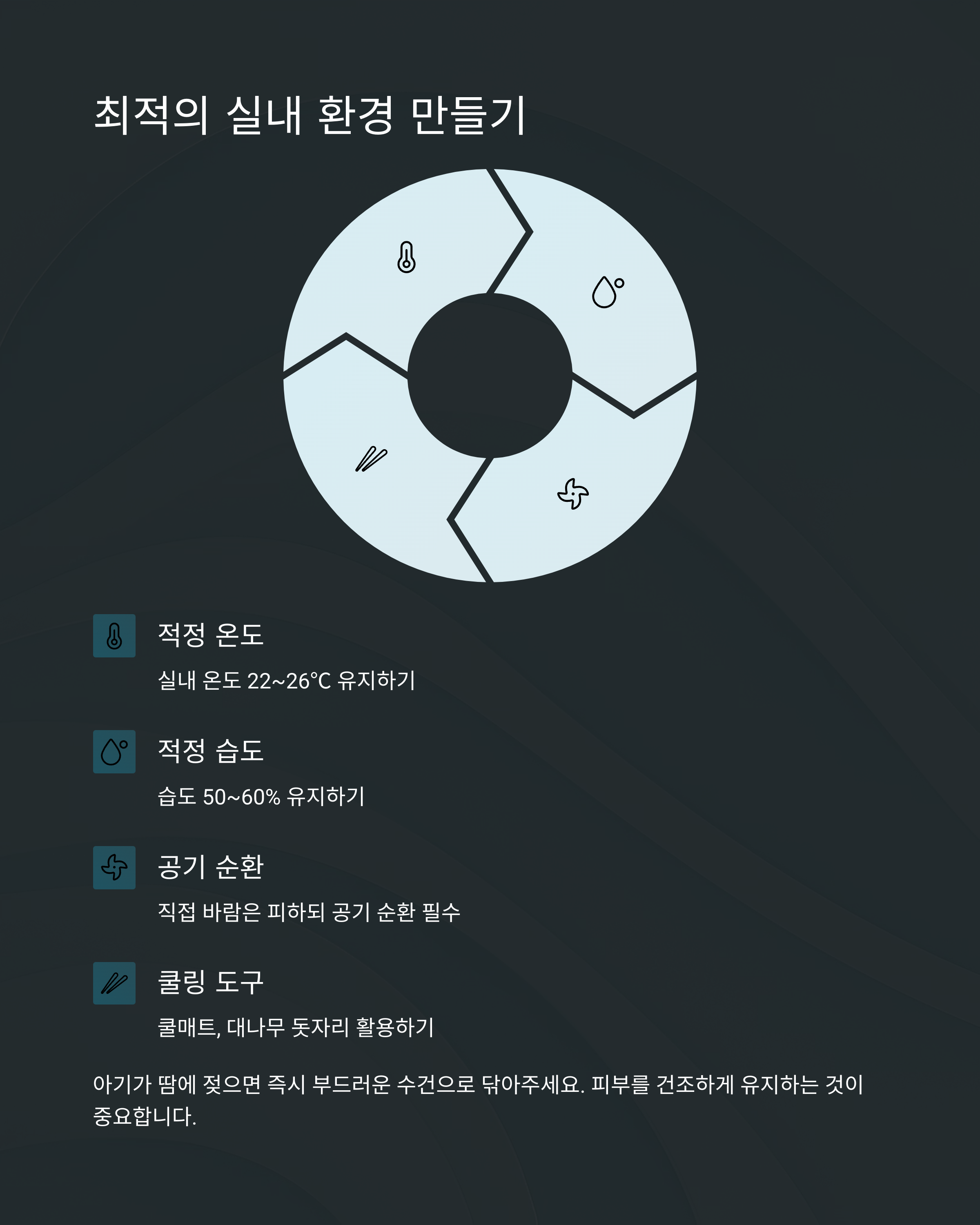 실내 온도는 23~25도, 습도는 **50~60%**를 유지하는 것이 이상적입니다.