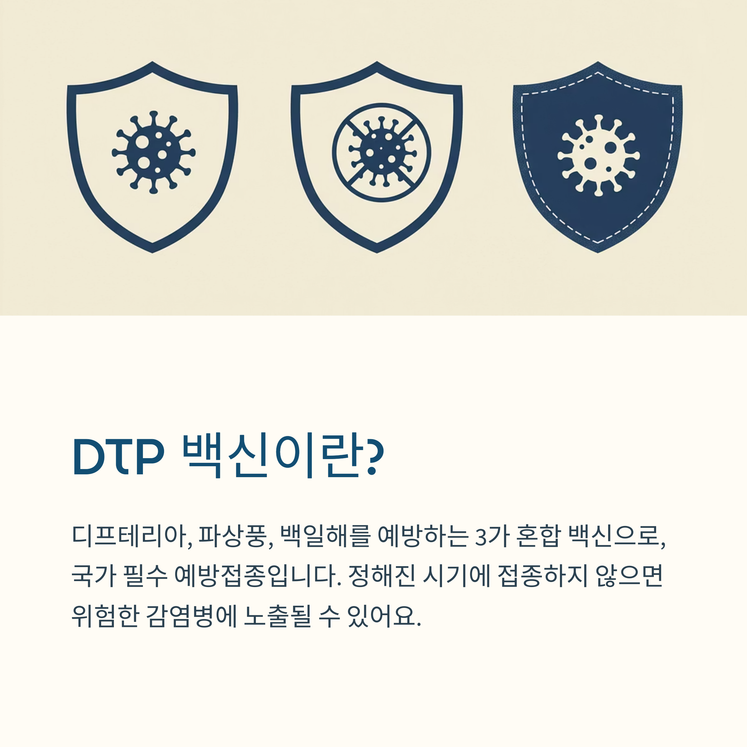 DTP 백신은 디프테리아(Diphtheria), 파상풍(Tetanus), 백일해(Pertussis)를 예방하는 3가 혼합 백신으로,