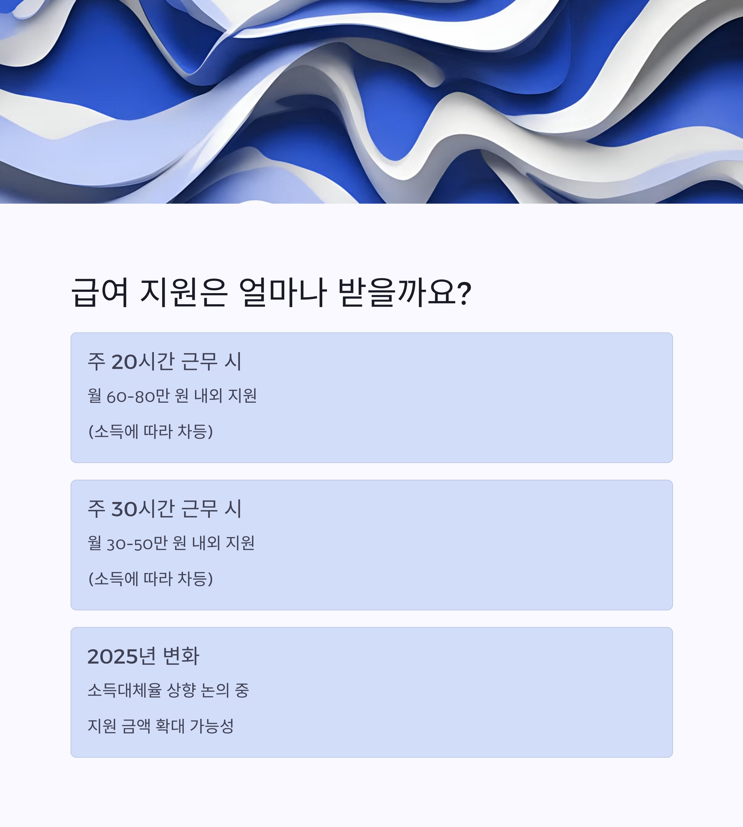 | 주 20시간 근무 | 월 60~80만 원 내외 (소득에 따라 차등) |
