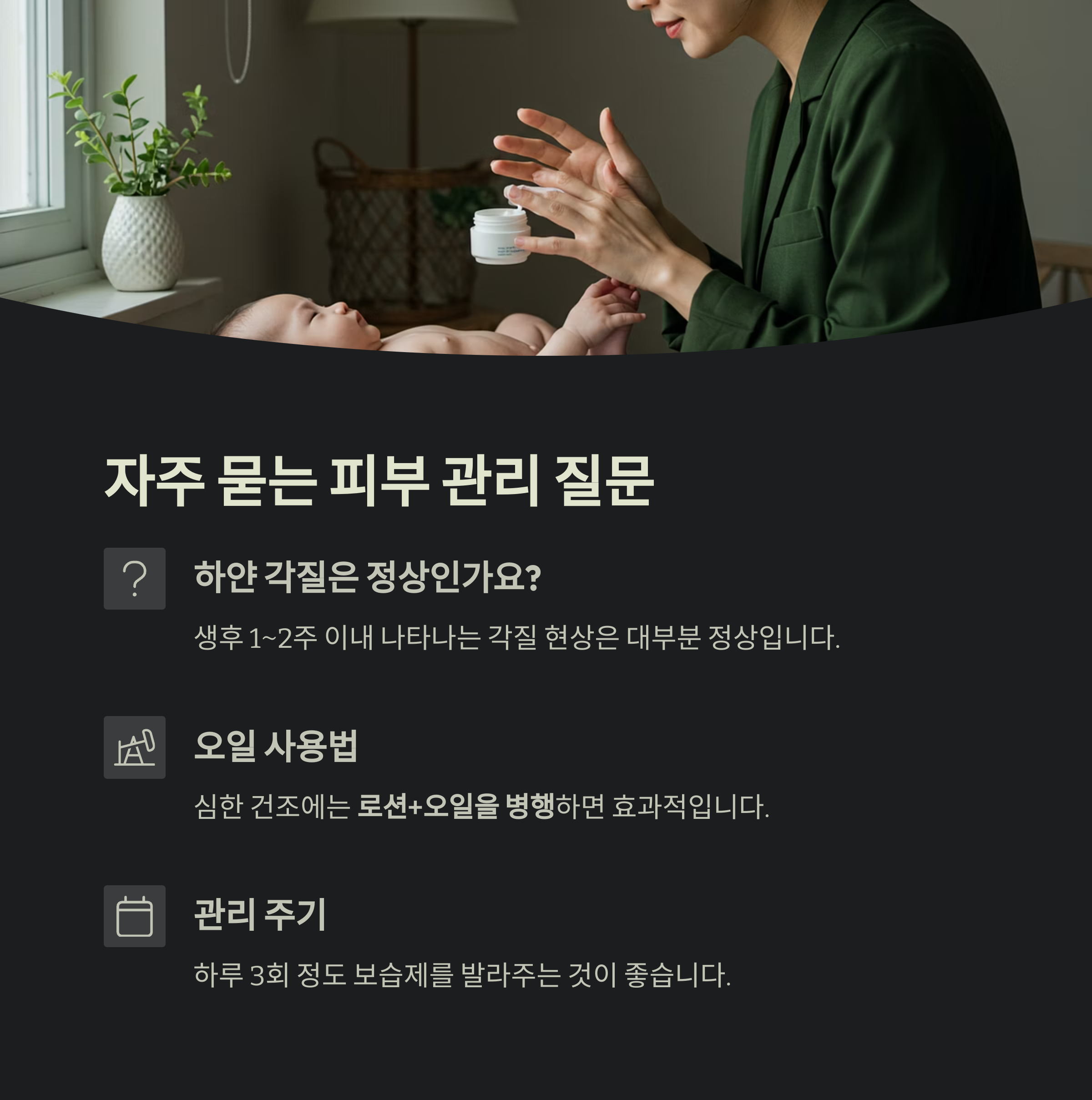 → 피부가 너무 건조하거나 갈라질 때는 로션+오일을 병행하면 효과적입니다
