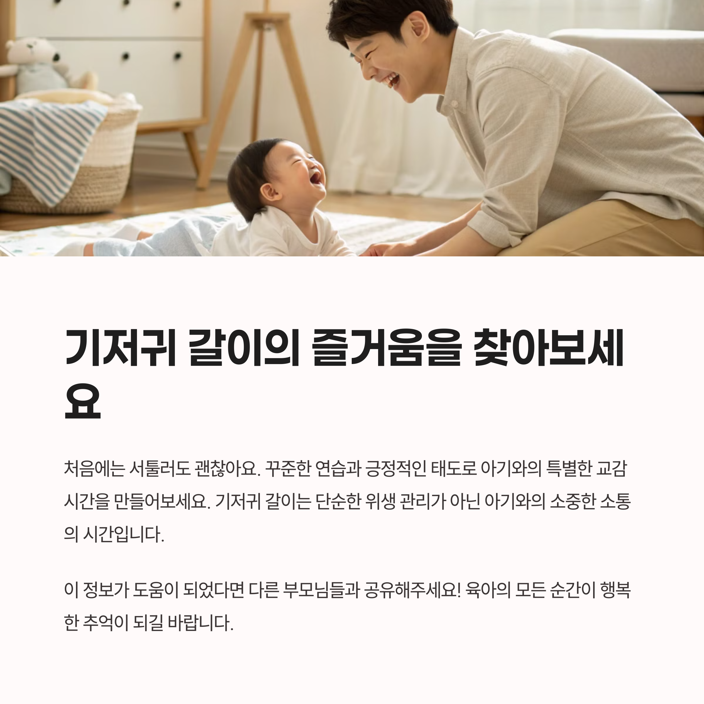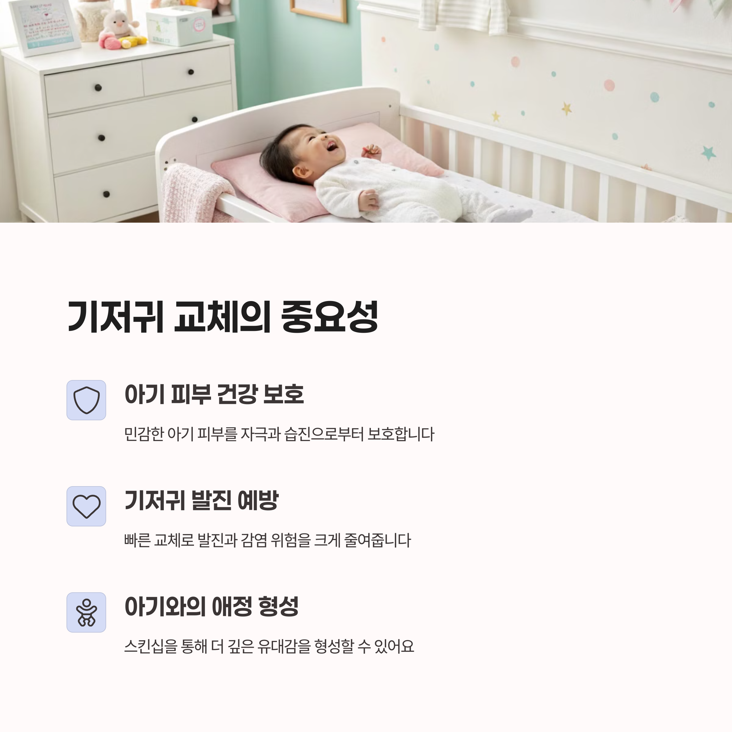 | 기저귀 갈이 시기 | 배변 후 즉시 교체가 아기 피부 건강에 좋아요. |