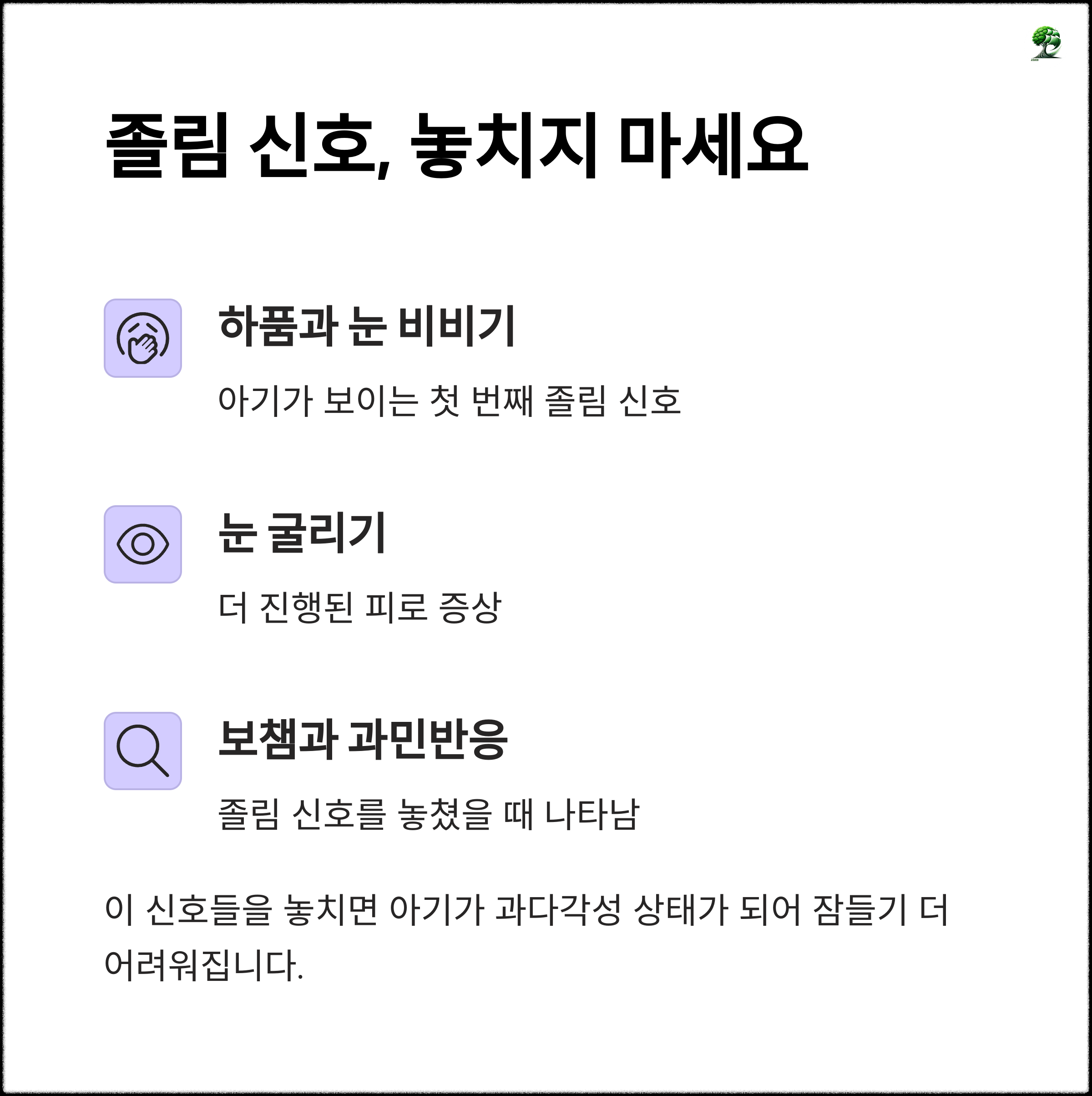 | 졸림 신호 | 수면 루틴 | 수면 환경 |