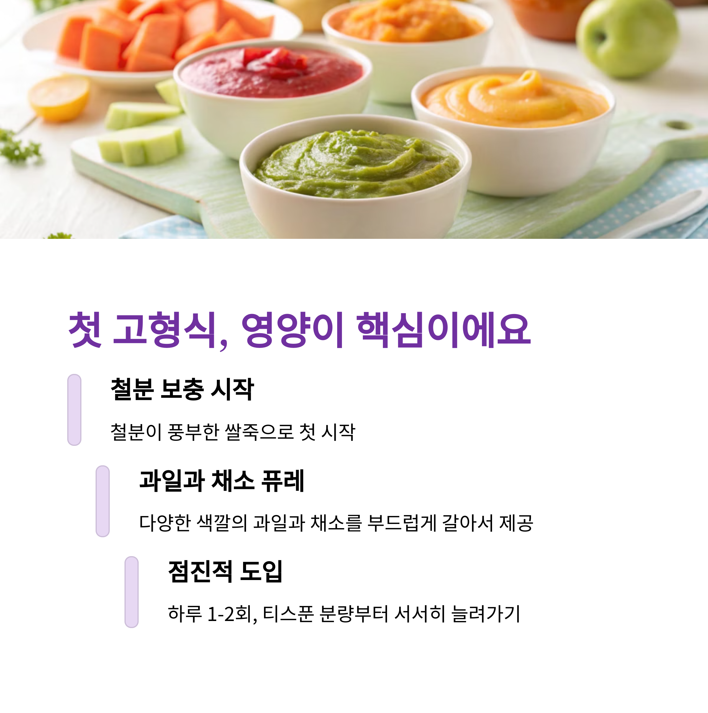 | 생후 12개월~15개월 시점이 적기입니다. | 부드러운 밥, 익힌 채소, 두부, 달걀 등 권장 | 아이의 식사 행동을 세심히 관찰하고 기록하세요. |