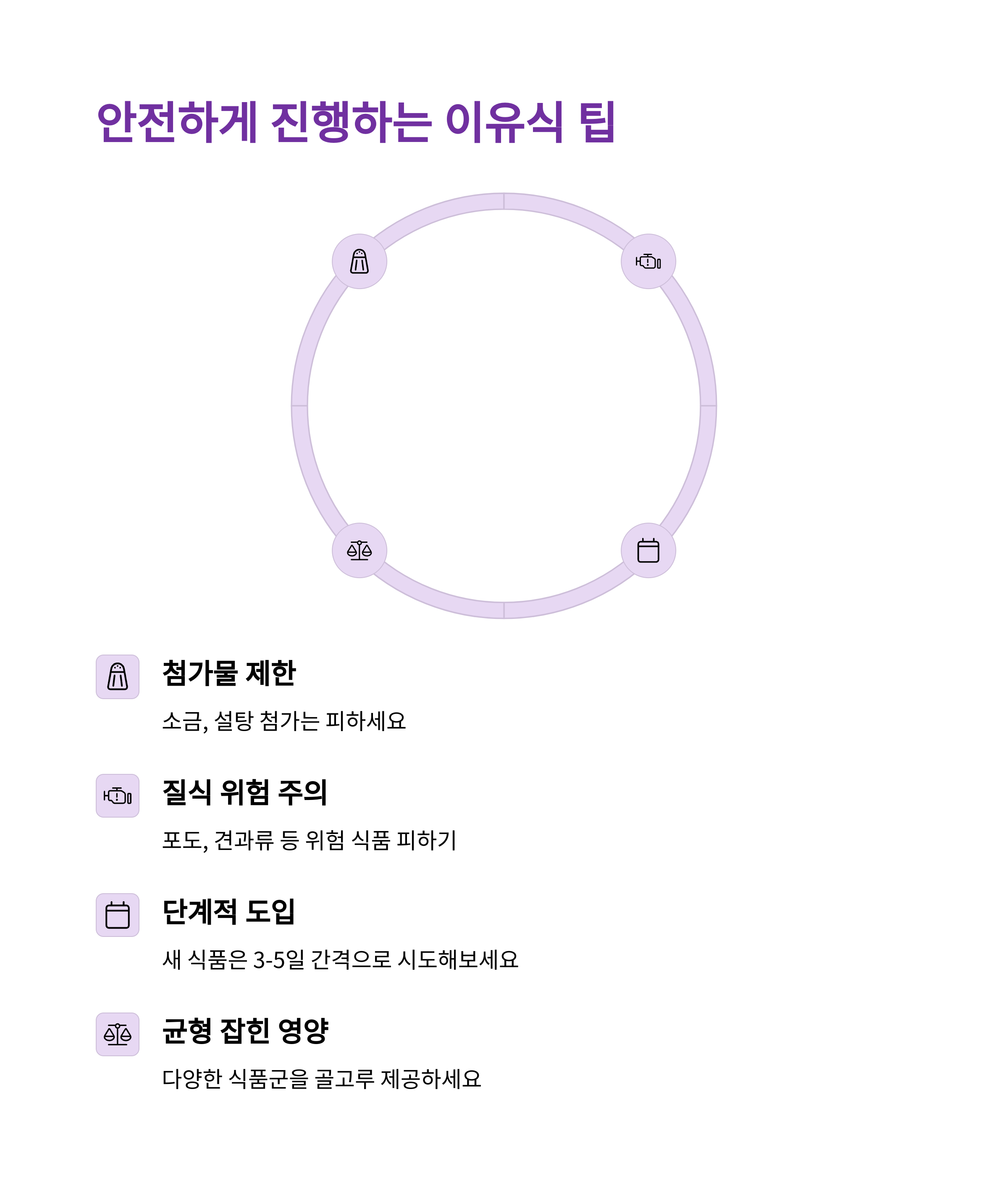 | 유아식 전환 시기 | 생후 12~15개월 사이에 전환이 권장됩니다. |