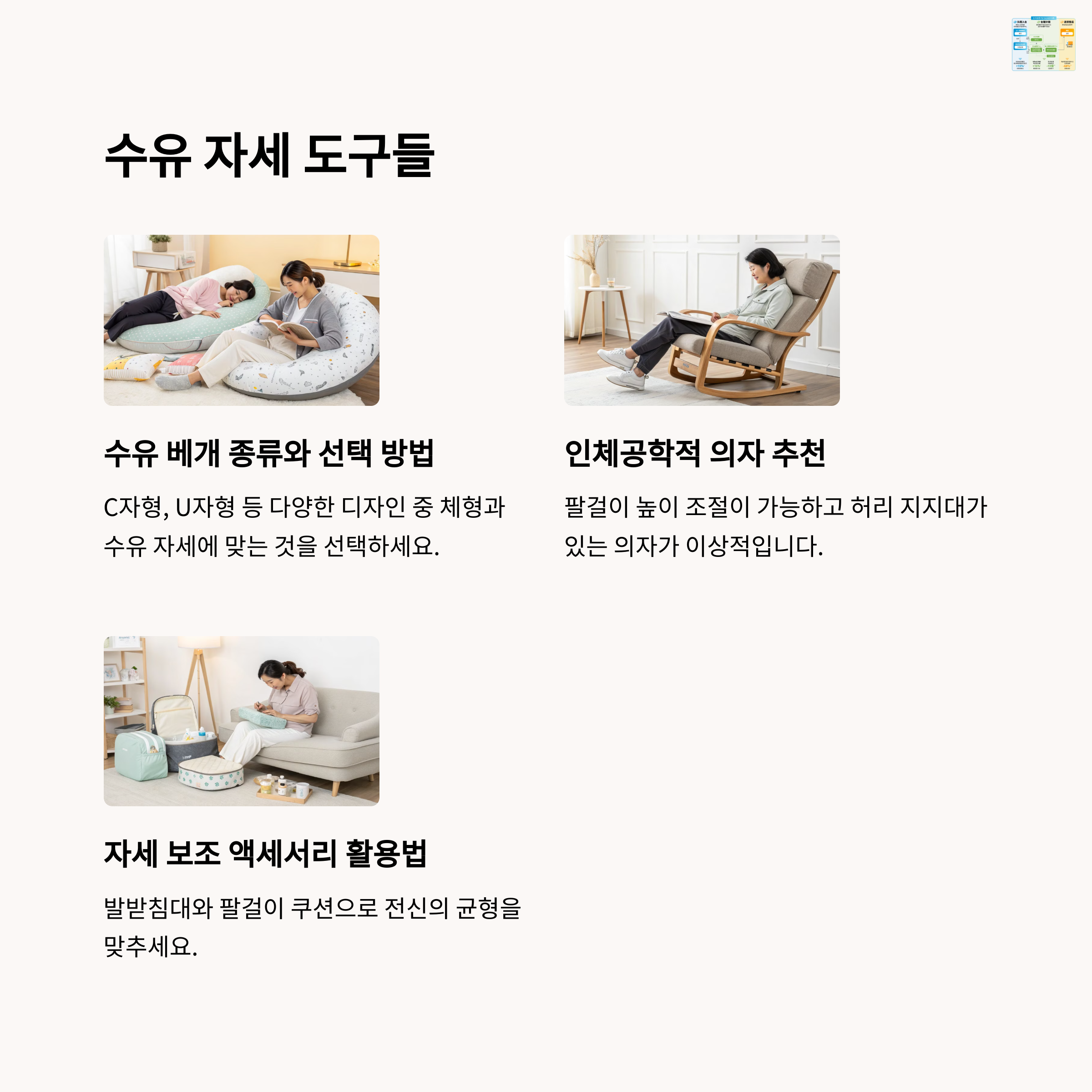흔히 추천되는 수유 자세로는 크래들홀드, 크로스홀드, 풋볼자세, 사이드라이잉 등이 있습니다. 하지만 엄마의 체형이나 출산 직후의 회복상태에 따라, 누군가에겐 편한 자세가 나에겐 불편할 수 있습니다. 그렇기 때문에 중요한 것은 특정 자세를 따라하기보다 내 몸과 아기에게 맞는 편안한 자세를 찾는 것입니다. 수유쿠션을 이용하거나, 등받이와 팔걸이가 있는 의자를 활용하면 자세 유지에 많은 도움이 됩니다.