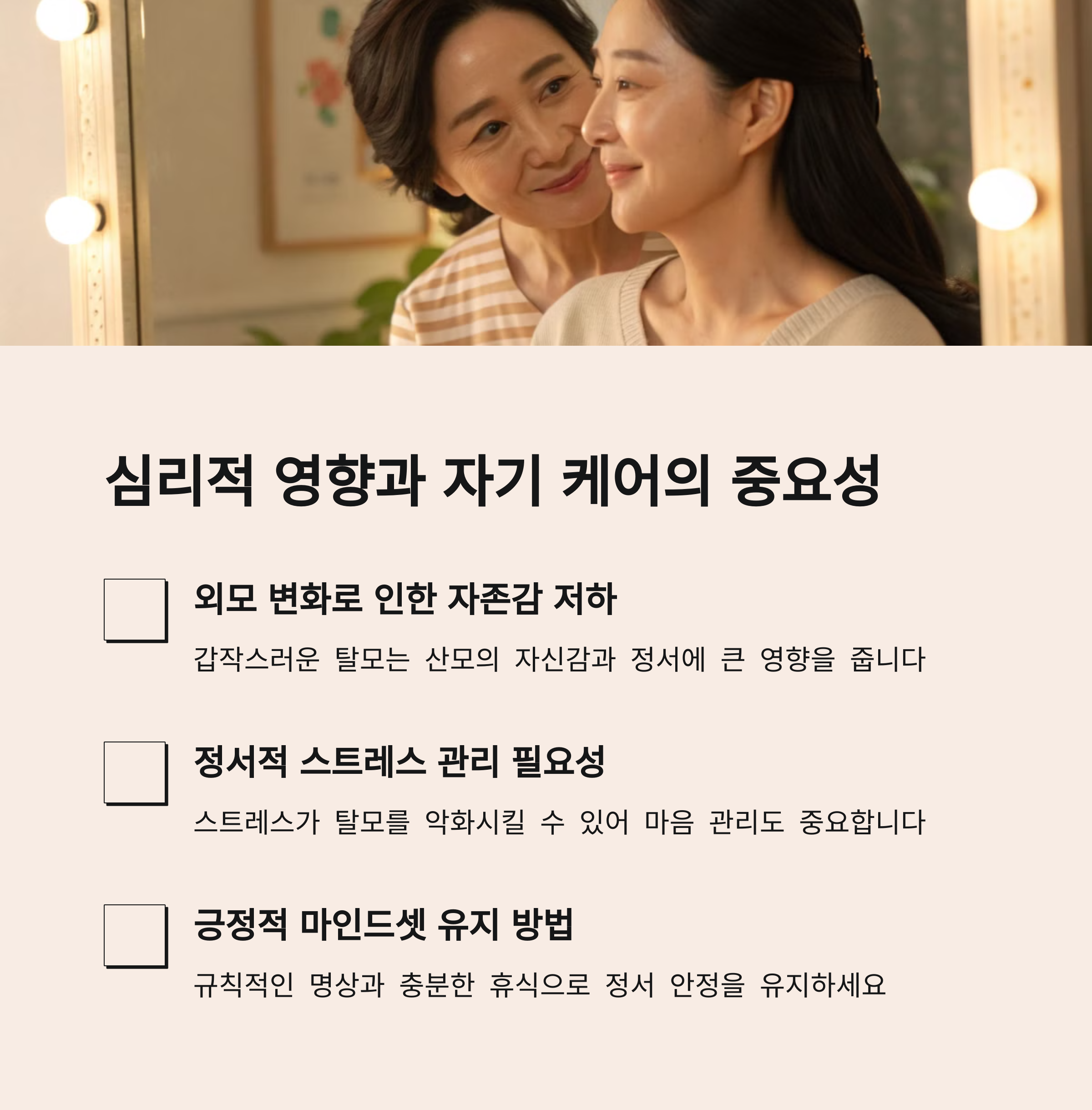 | 호르몬 변화와 스트레스가 큰 요인입니다. | 순한 샴푸, 토닉 사용이 도움이 됩니다. | 두피 앰플, 자연 유래 샴푸를 추천해요. |