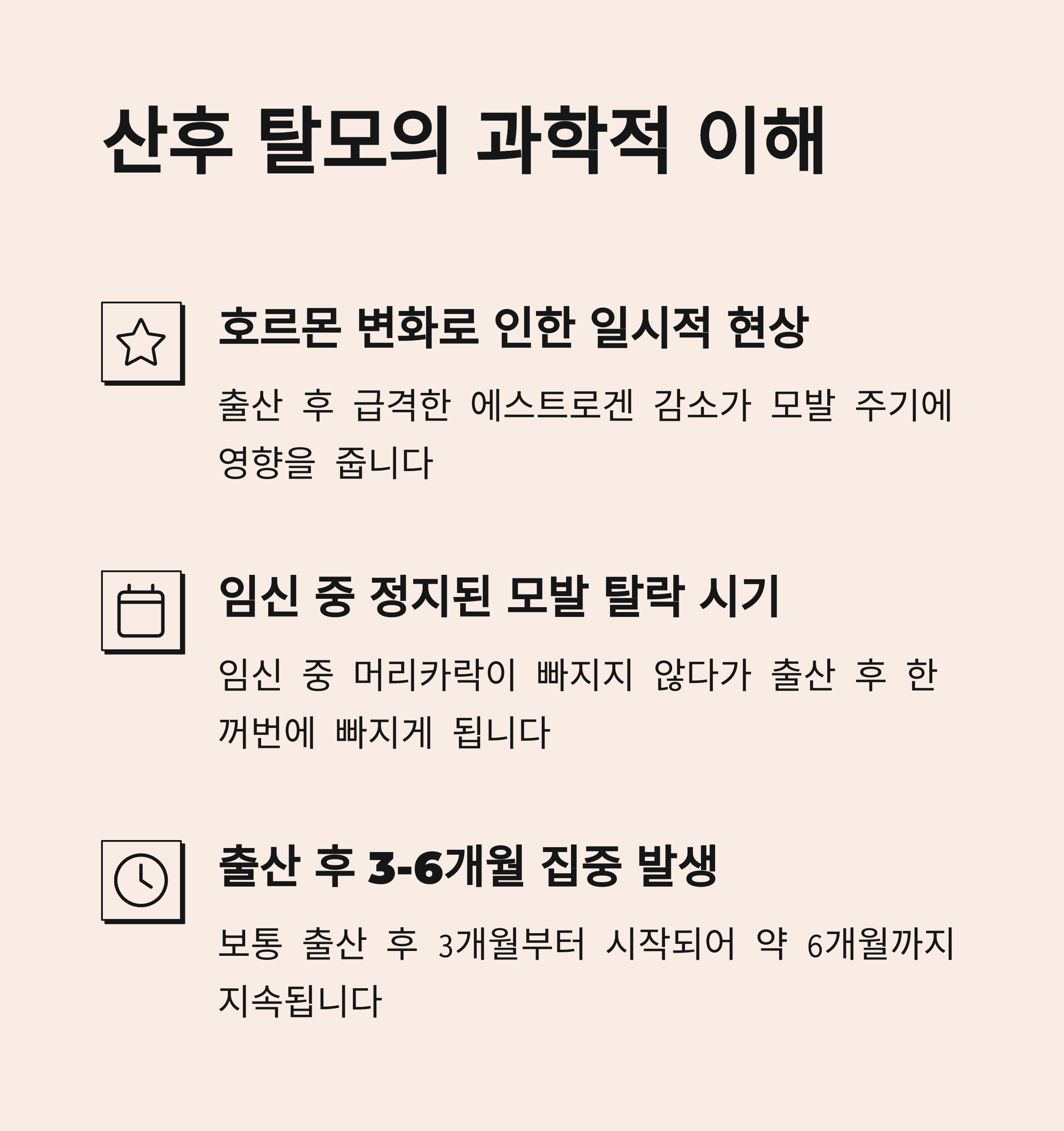| 산후 탈모 원인 | 호르몬 변화로 인해 휴지기 모발 비율이 증가합니다. |