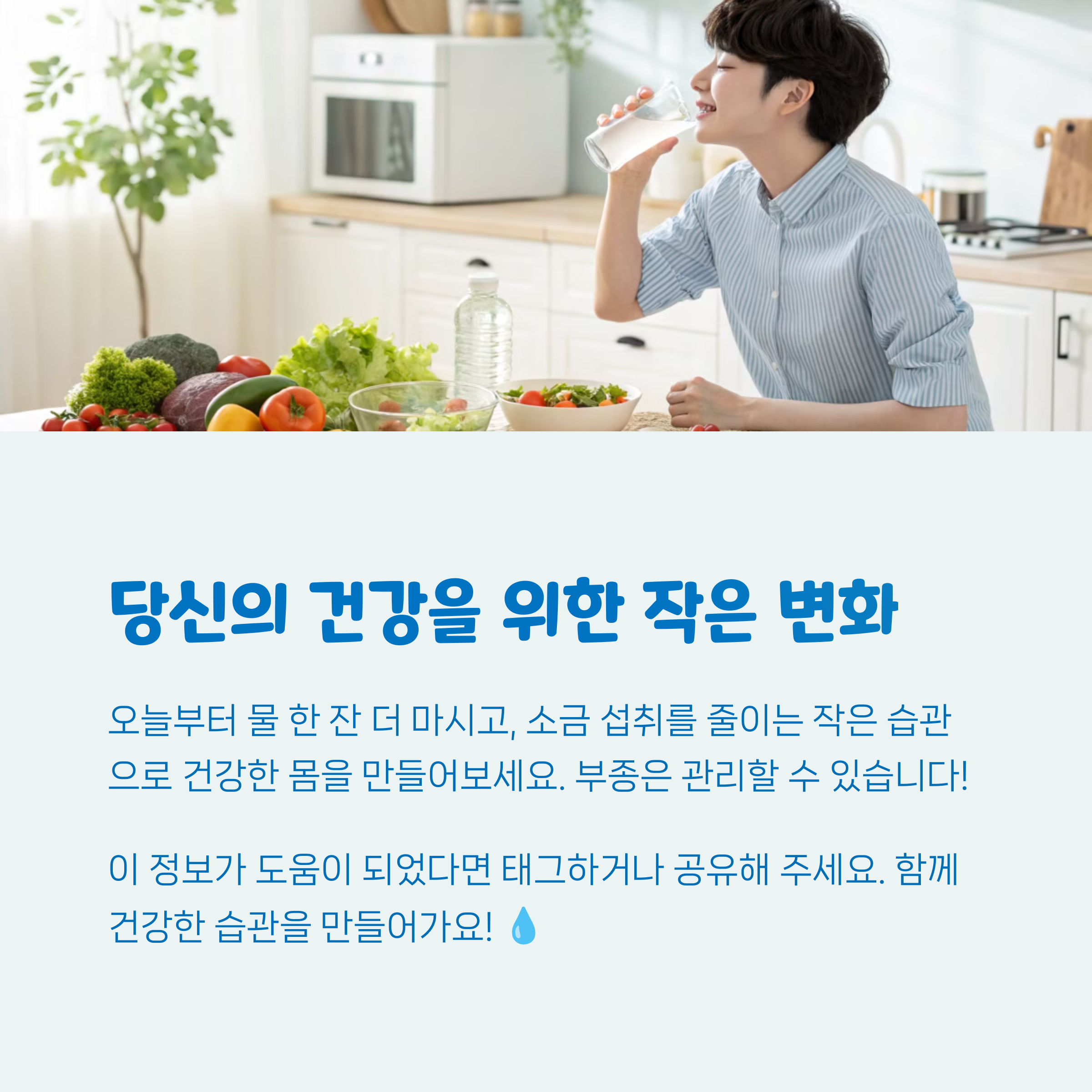 | 나트륨을 줄이고 신선한 식재료 위주로 구성하세요. | 다리, 종아리 중심으로 간단한 동작을 실천해요. | 하루 1.5~2리터의 물을 나누어 마셔보세요. |