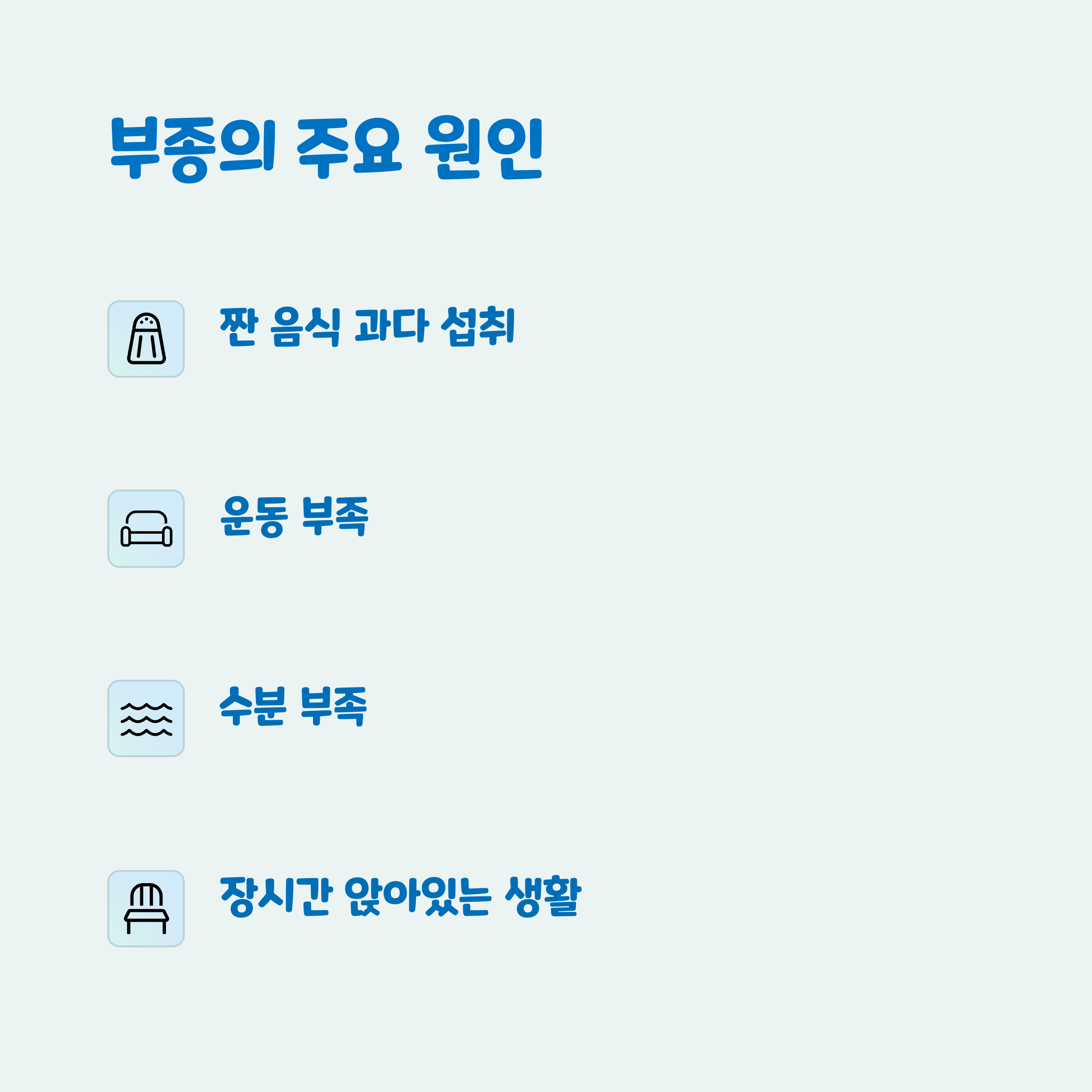 | 부종 원인 | 나트륨 섭취, 운동 부족, 혈액순환 저하 등이 있습니다. |