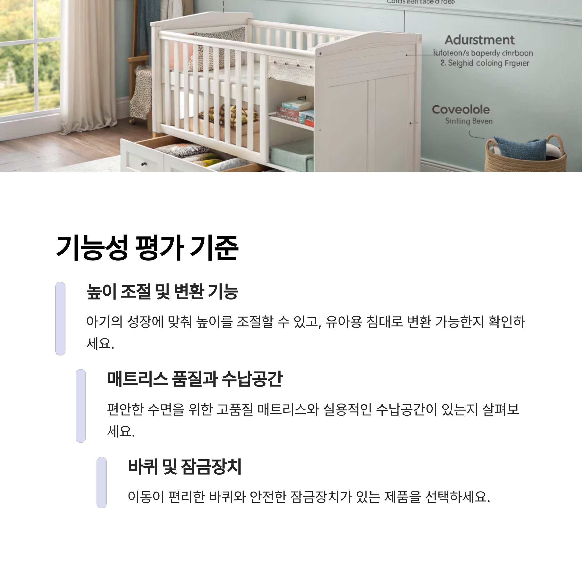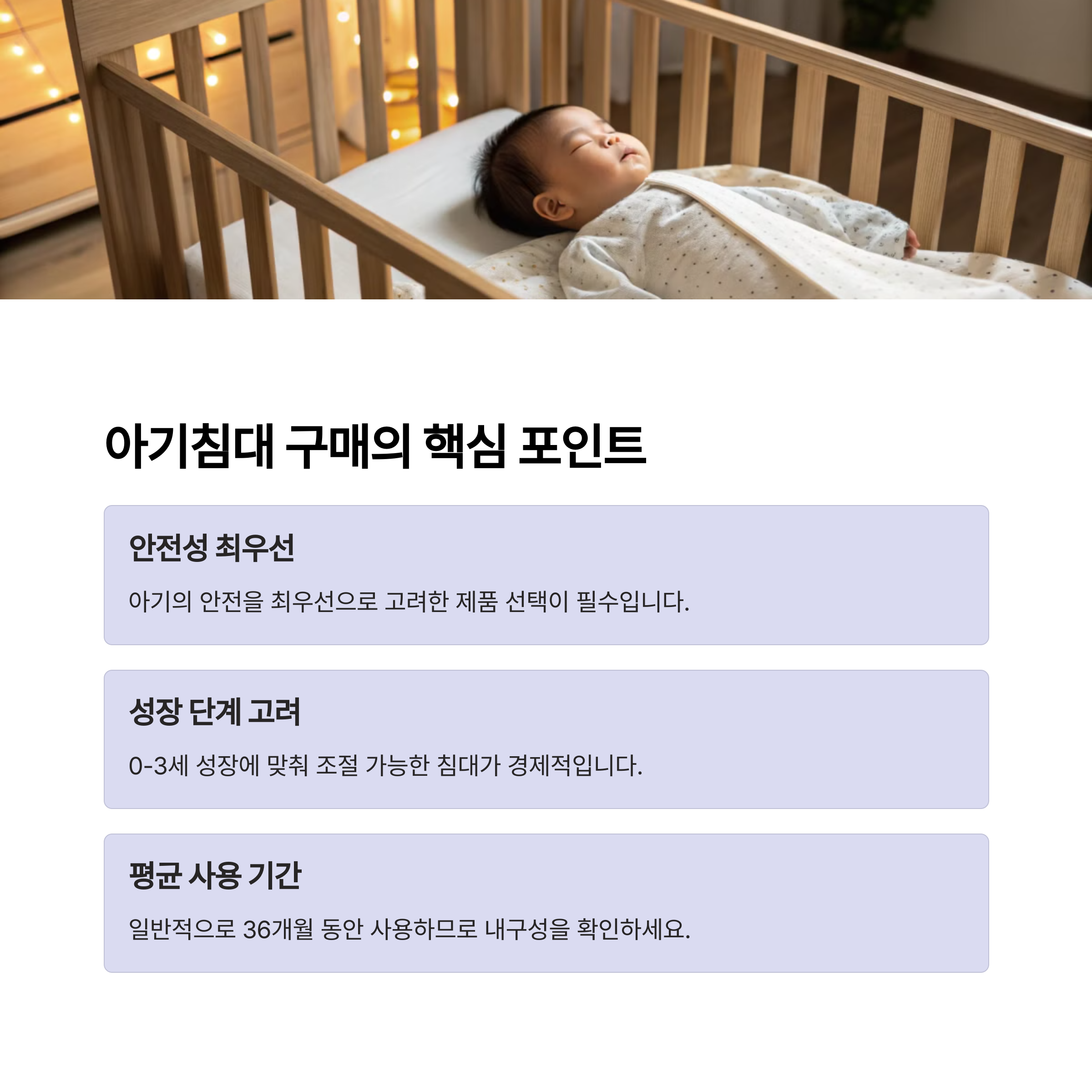 | 아기침대 구매 기준 | 안전성, 내구성, 소재 등 핵심 요소를 꼼꼼히 고려해야 해요 |