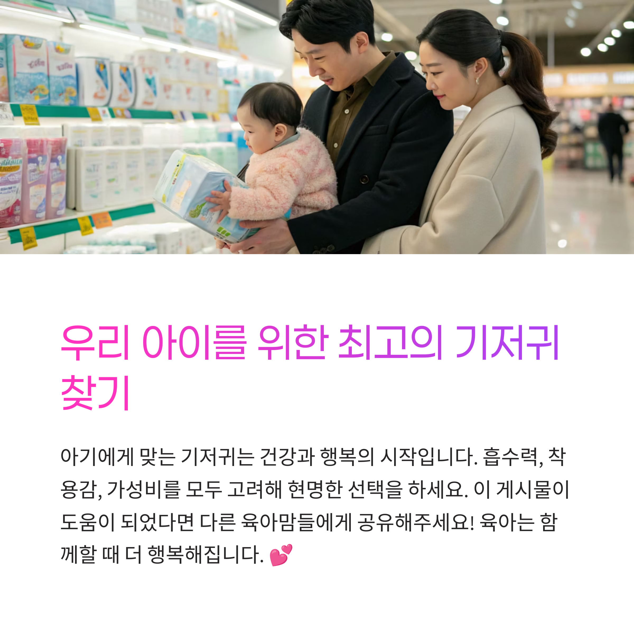 아기에게 좋은 기저귀를 선택하는 것은 단순한 소비를 넘어서 아이의 건강과 행복을 위한 중요한 결정입니다. 수많은 브랜드가 있지만 어떤 제품이 흡수력이 뛰어나고, 어떤 제품이 피부 자극</strong 없이 착용감을 유지하는지는 육아 초보자에게는 어려운 선택일 수 있습니다. 부모님의 고민을 덜어드리기 위해, 오늘은 시중에서 많이 사용되는 기저귀 브랜드들을 직접 비교해보고자 합니다. 본 포스팅에서는 단순한 제품 설명이 아닌, 실제 사용자 경험과 전문가 의견을 반영하여 흡수력, 착용감, 가성비 등의 관점에서 정리해드립니다. 아이의 피부는 민감하고 연약하기 때문에, 기저귀 선택에 따라 발진 예방이나 밤새 보송함 유지 같은 중요한 차이를 만들어낼 수 있습니다. 부모님의 시간과 수고를 덜어드리고, 아이에게는 더 좋은 하루를 만들어주기 위한 정보가 가득 담겨 있으니 끝까지 함께해 주세요.