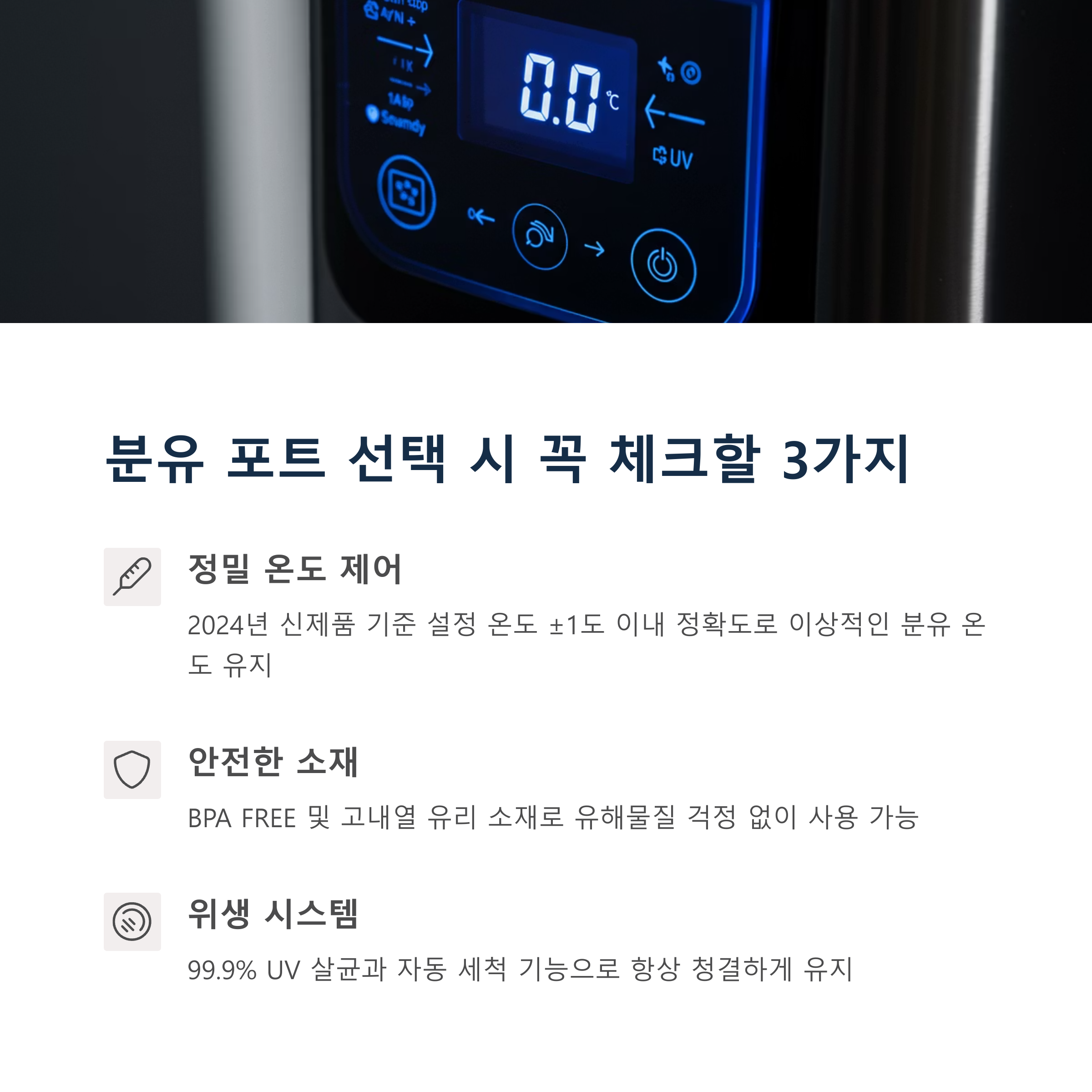 | 밤중 수유 시 빠른 분유 준비에 도움 | 신생아 건강을 위한 필수 조건 | 위생 관리 부담을 덜어주는 기능적 요소 |