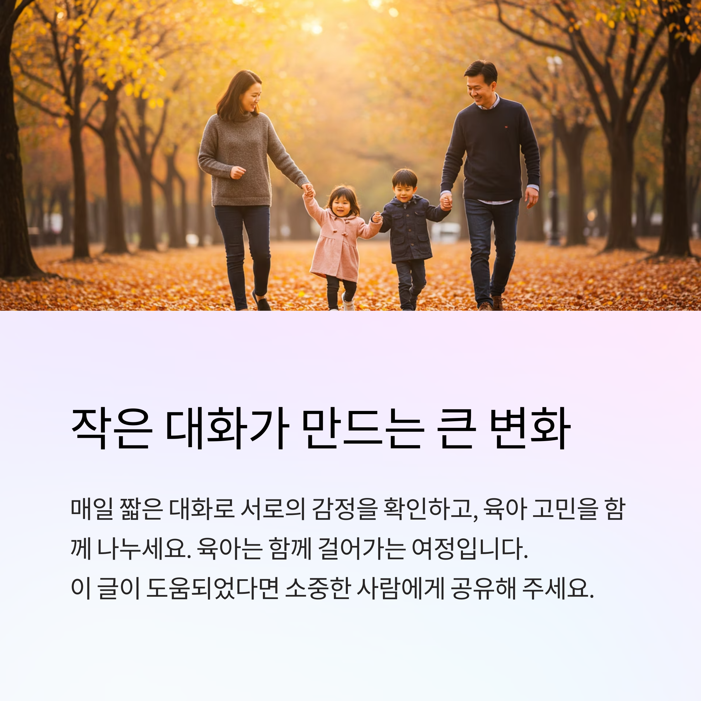 갈등을 줄이는 데 가장 효과적인 방법 중 하나는 바로 '대화의 시간'입니다. 하루 10분이라도 둘만의 시간을 확보해 아이에 대한 고민, 서로의 피로감, 감정 상태를 솔직하게 나누는 시간을 가져보세요. 이때 중요한 건 평가나 지적이 아닌 '이해하려는 자세'입니다. "당신도 힘들었겠다"는 한 마디가 하루의 고단함을 녹일 수 있습니다.