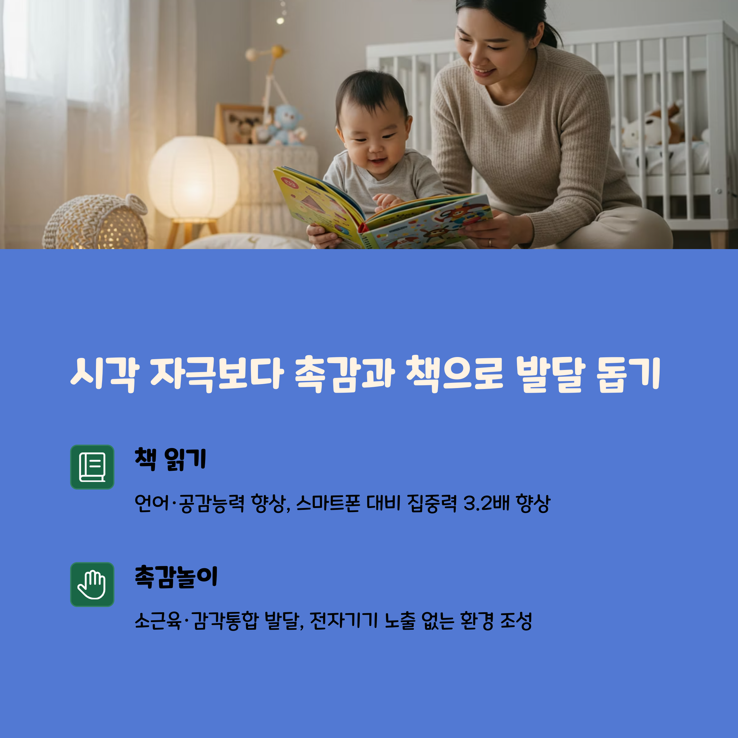 | 생후 6개월부터 위험성이 증가함 | 그림책, 촉각놀이, 신체 놀이 | 부모가 먼저 스마트폰을 멀리해야 함 |