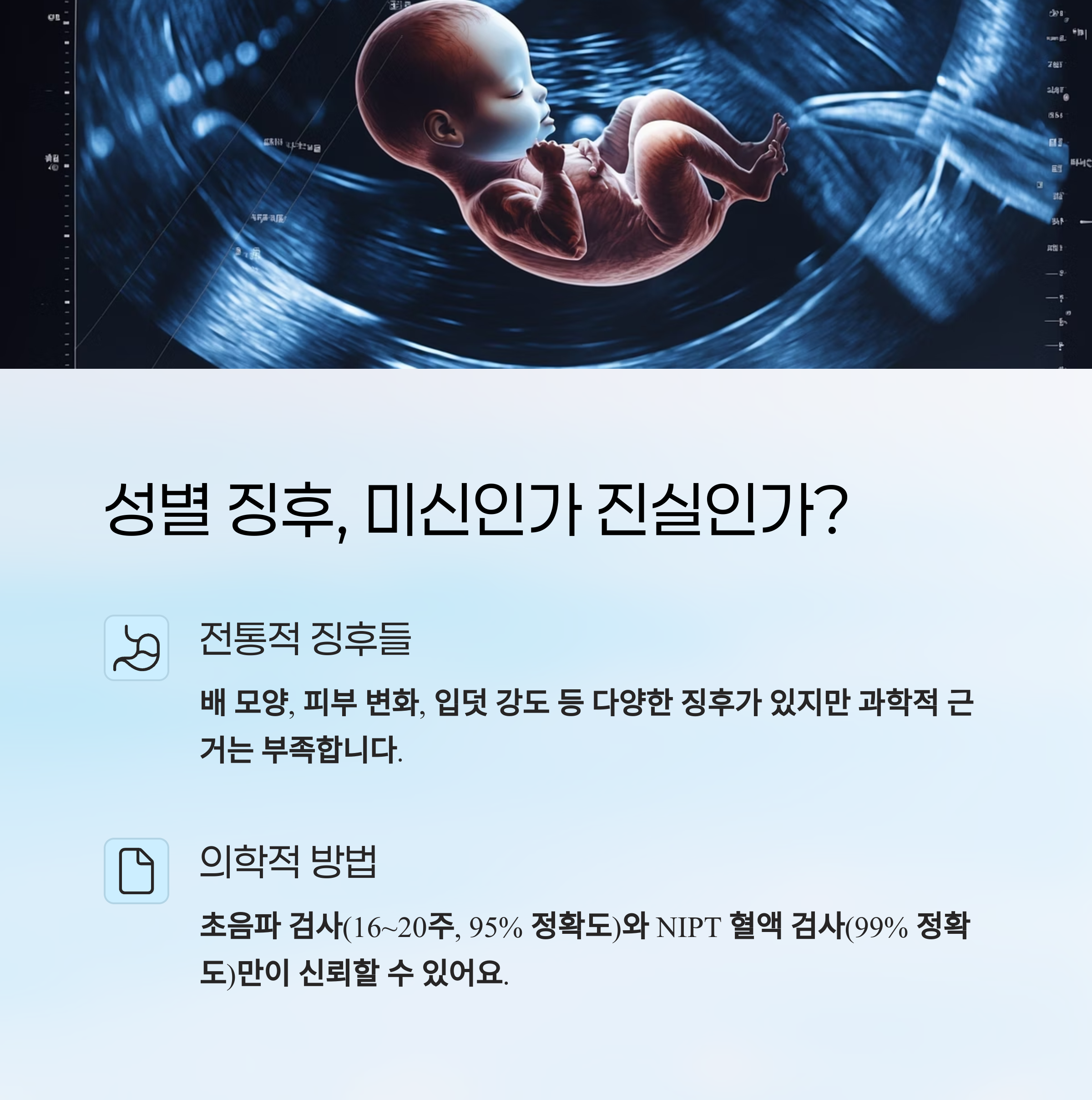 | 아기 성별은 임신 중 많은 관심을 받는 주제입니다. | 배 모양, 피부, 입맛 변화 등으로 예측합니다. | 일부는 의학적으로 확인되지만 대부분은 미신입니다. |