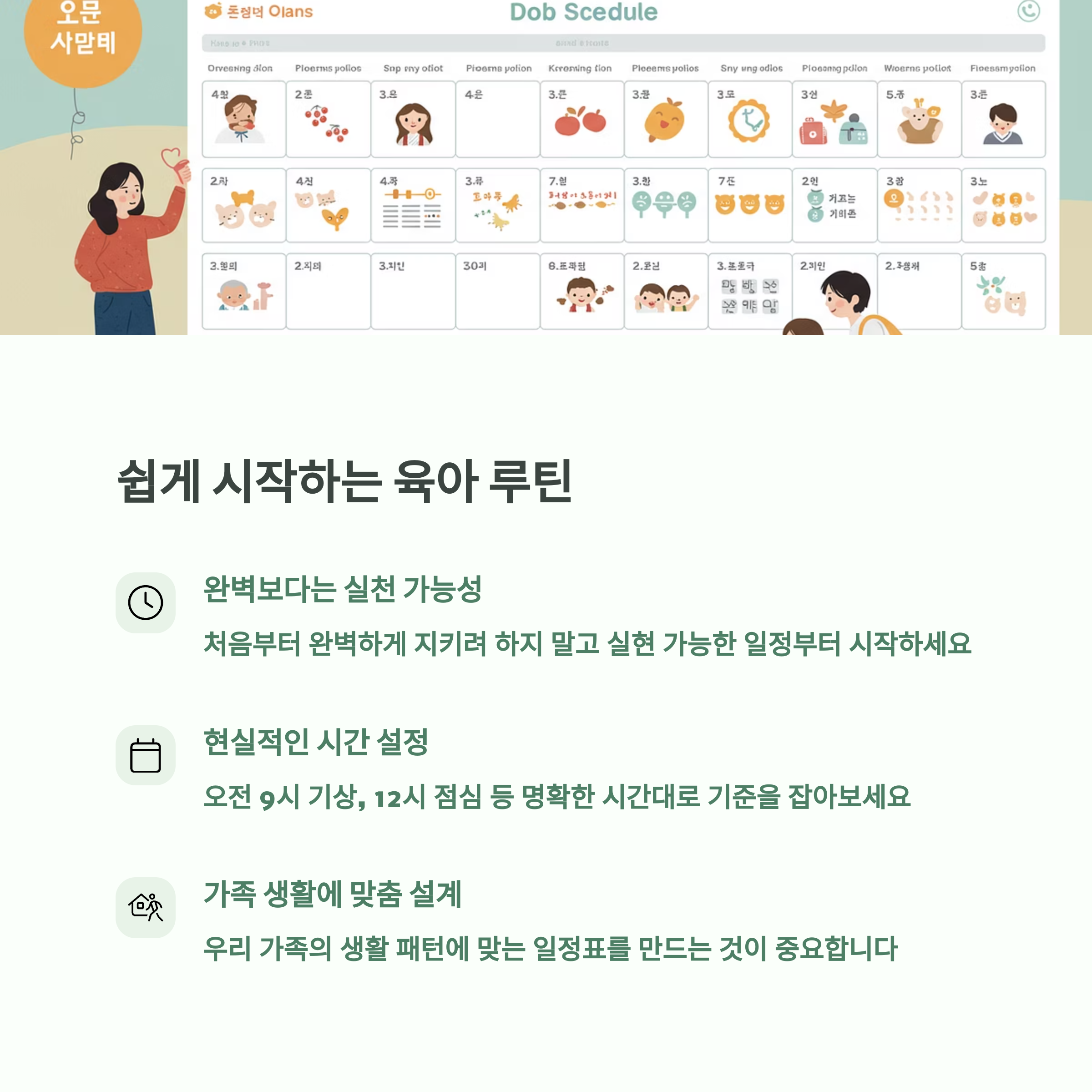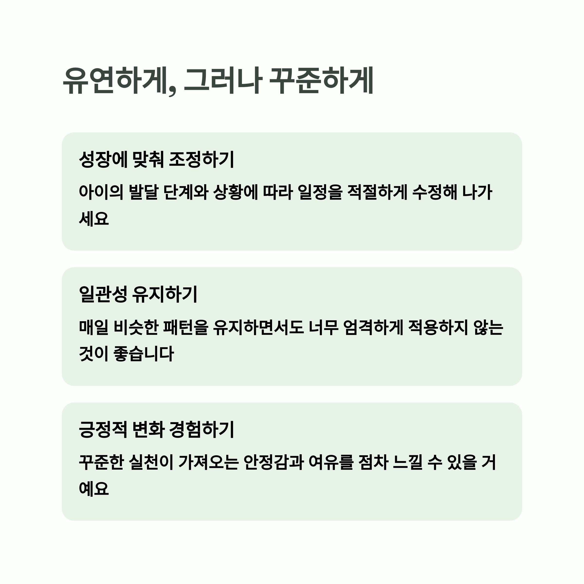 일정표를 실천하는 데 있어 가장 중요한 것은 지속성과 가족 구성원의 협조입니다. 혼자만 노력한다고 유지되기 어렵기 때문에 배우자나 조부모님과도 충분히 상의하고 함께 시간을 조율해야 합니다. 아이가 크면서 루틴이 달라질 수 있다는 점도 고려하여 유연한 태도를 유지하는 것이 좋습니다. 완벽한 일정표보다 실현 가능한 구조가 우선이라는 점, 잊지 마세요.