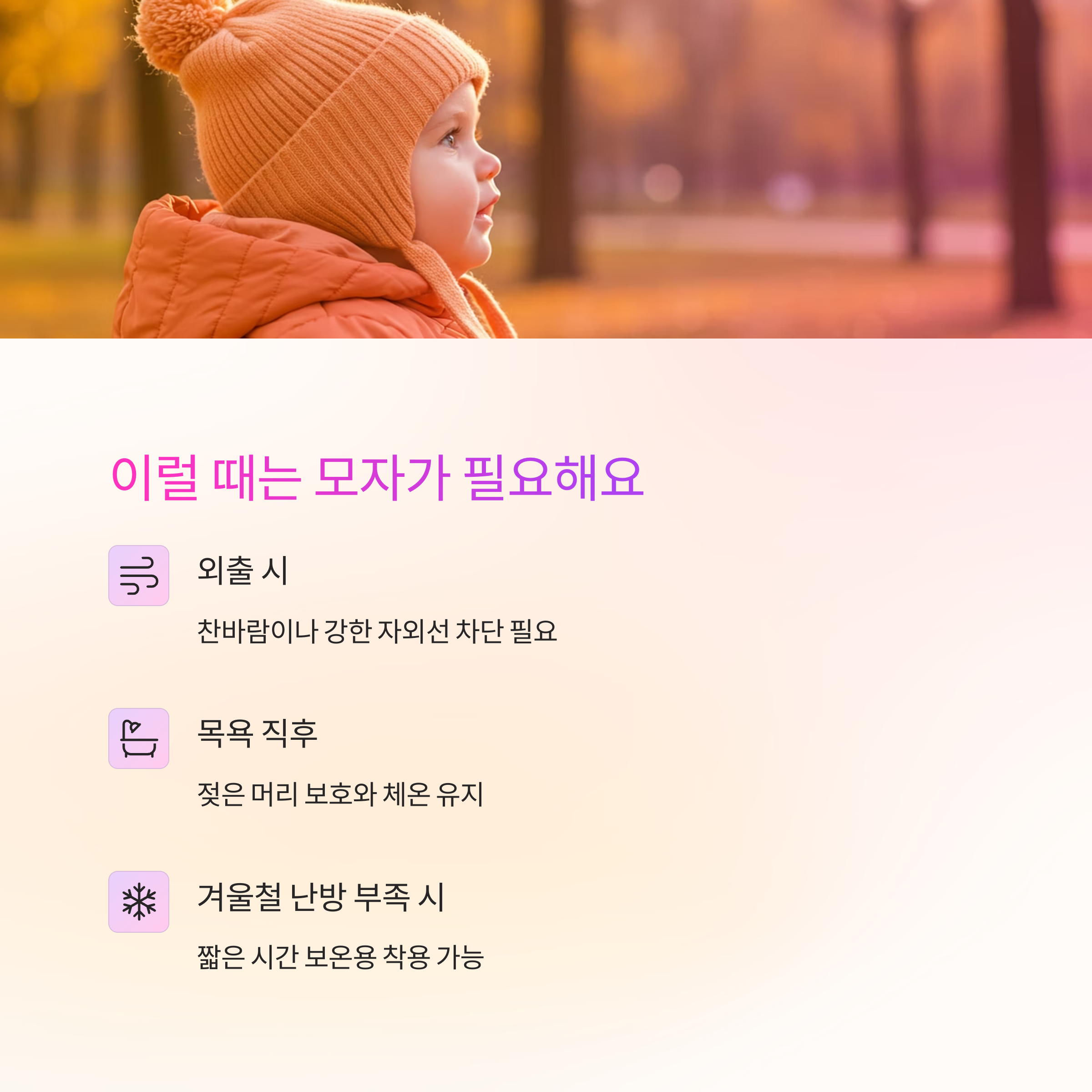 | 목욕 직후 | 젖은 머리를 보호하고 체온 유지 |