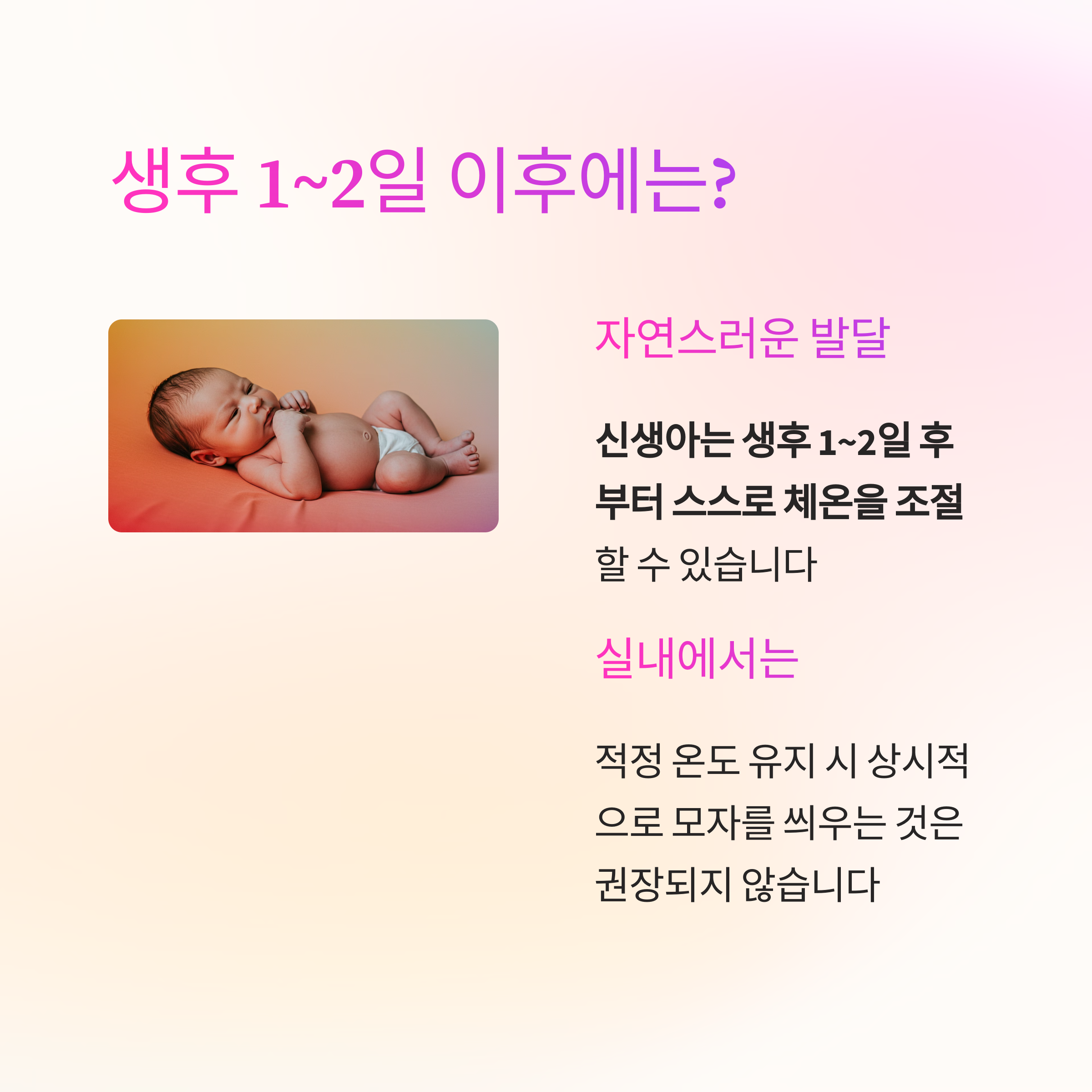 대부분의 경우, 신생아는 생후 1~2일 후부터 스스로 체온을 조절할 수 있습니다.