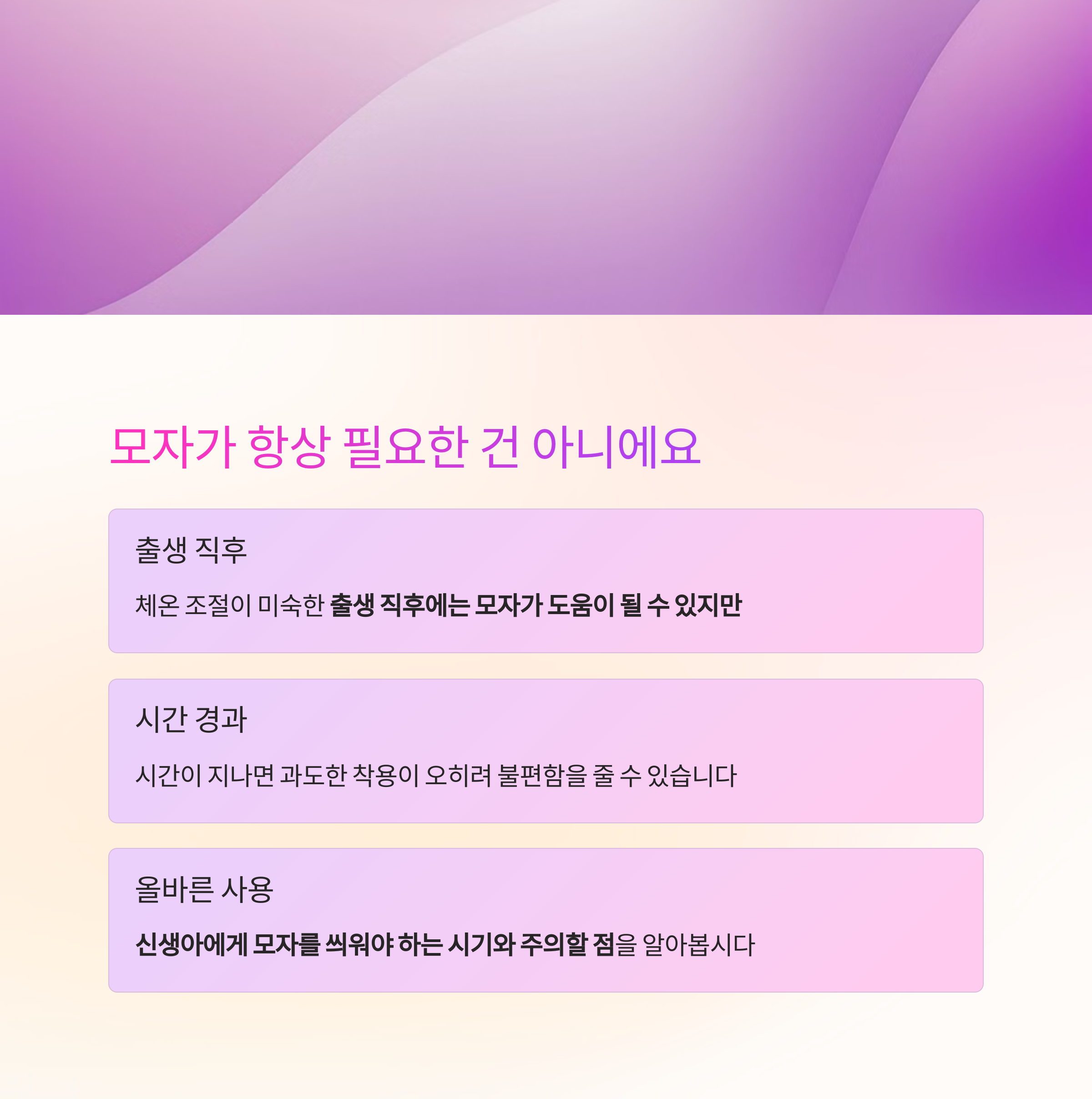 모자 착용이 오히려 아기 불편을 유발할 수 있다는 점을 강조합니다.