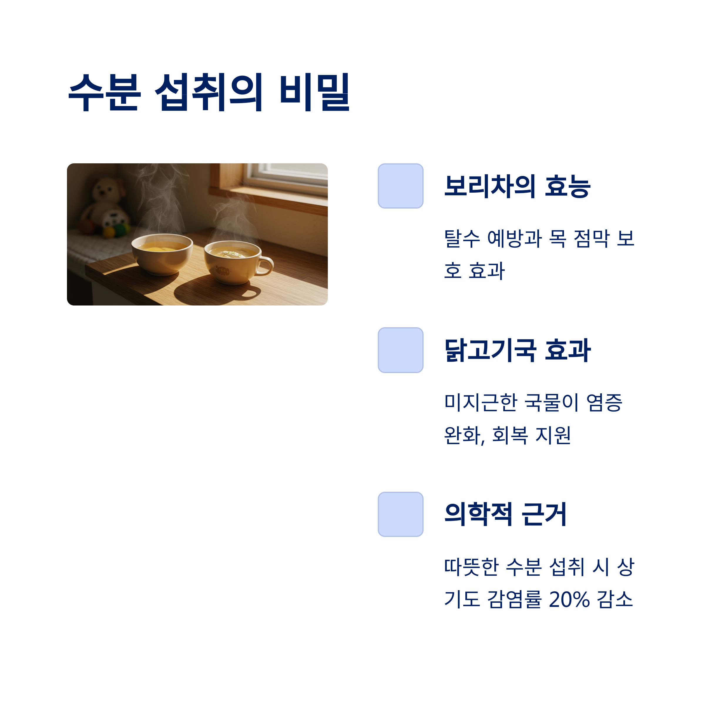 찬 음료보다는 미지근하거나 따뜻한 수분 섭취가 중요합니다.