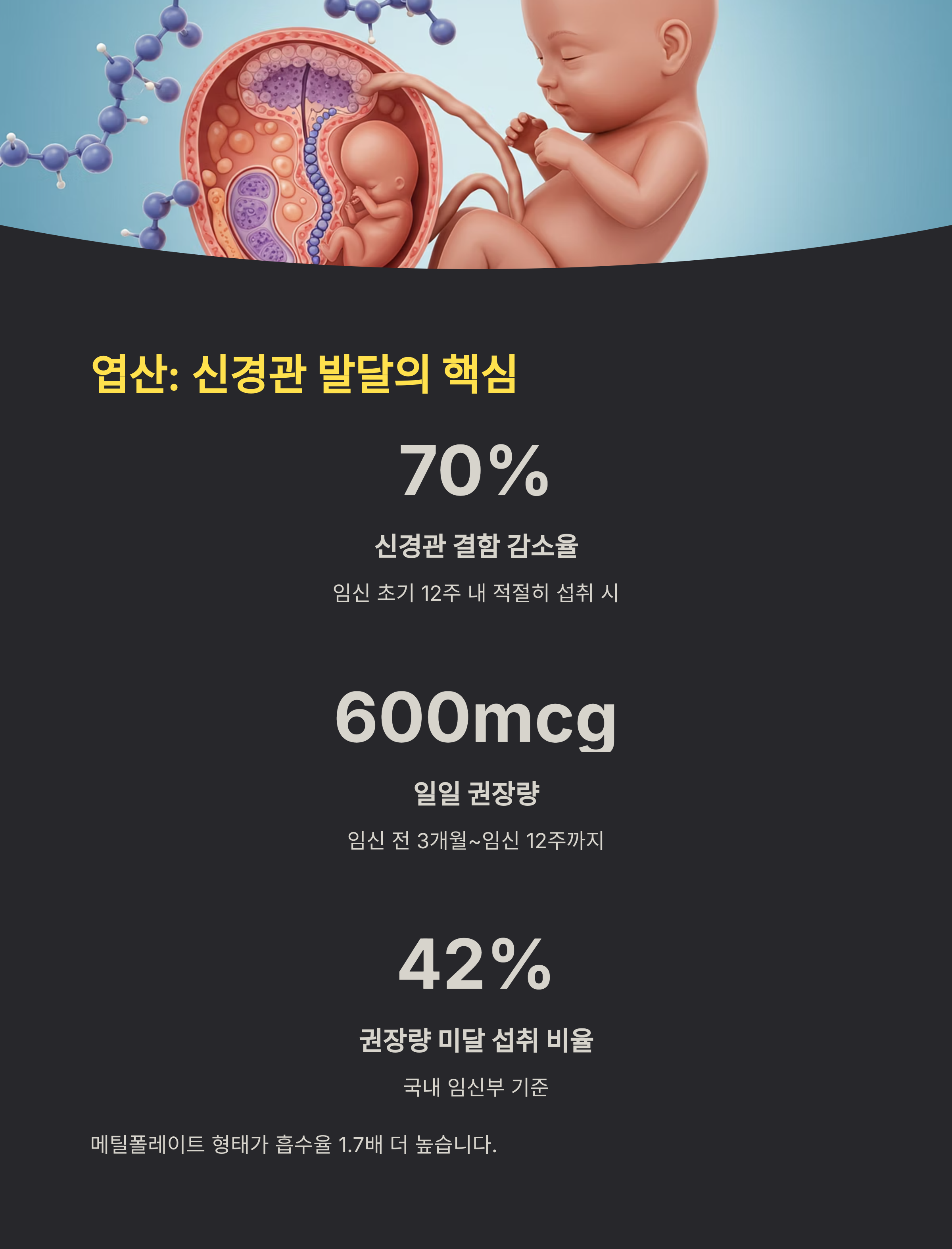 엽산은 임신 초기에 태아의 신경관 결손을 예방하는 데 핵심적인 역할을 합니다.